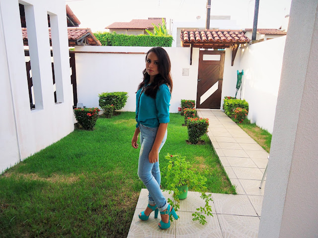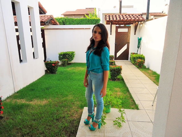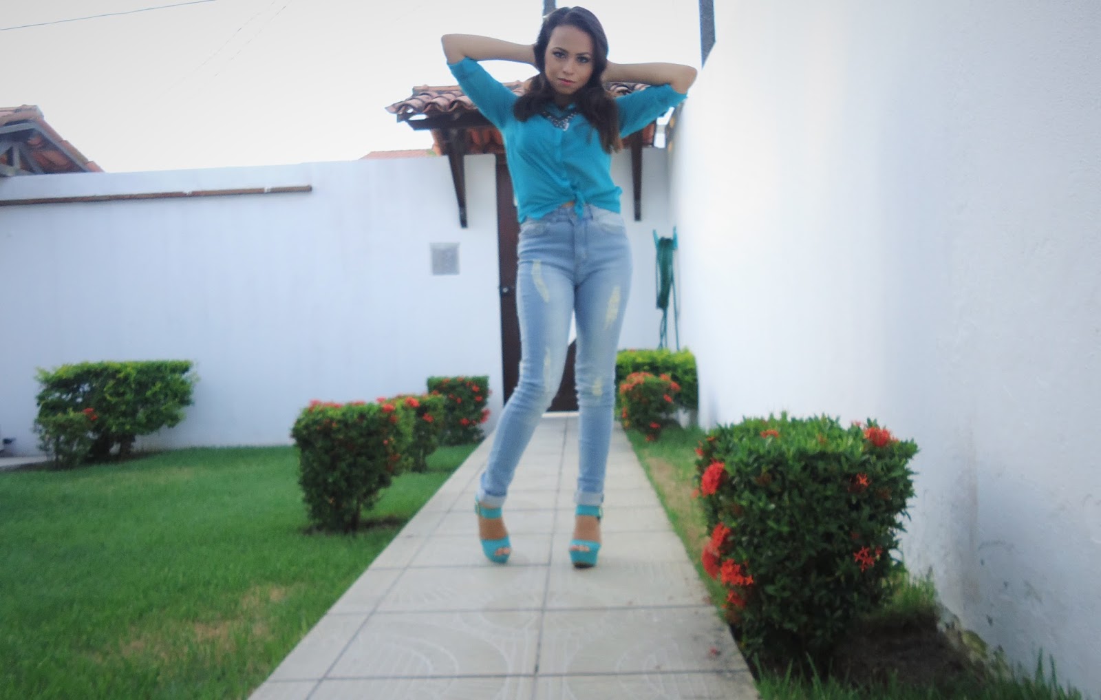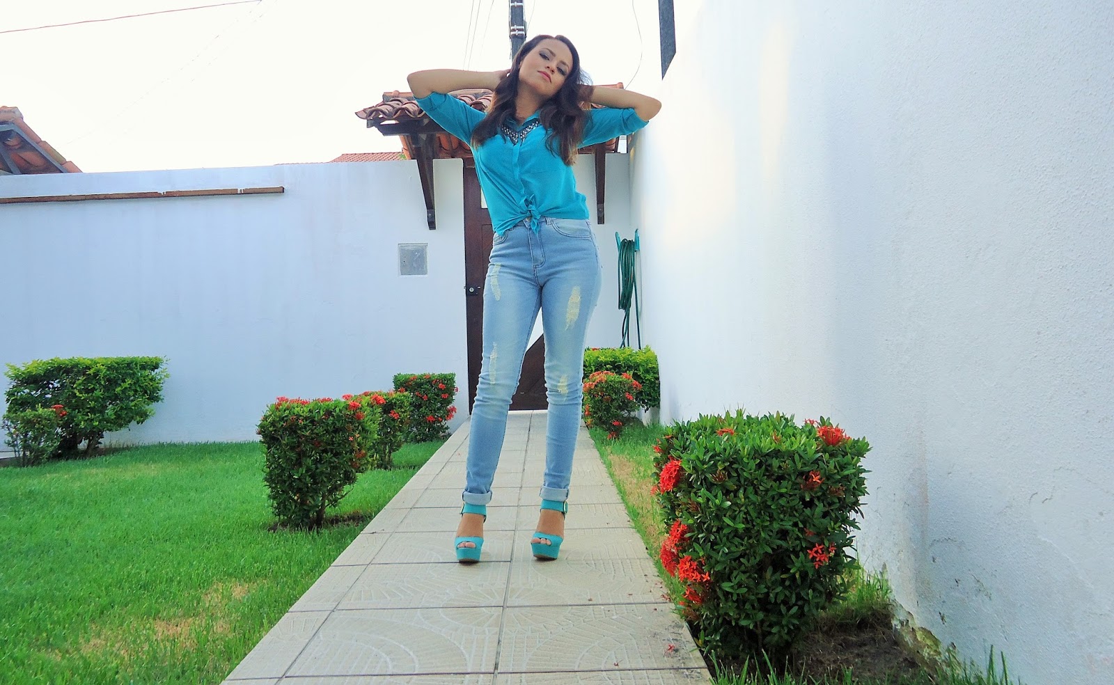 Optei por essa camisa azul turquesa amarrada com um nozinho