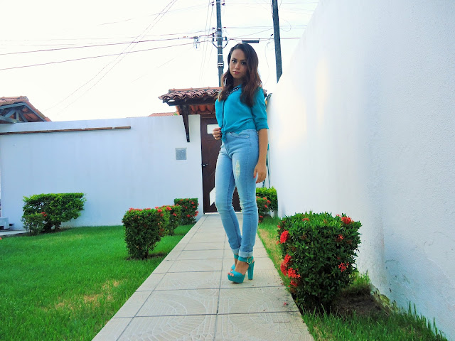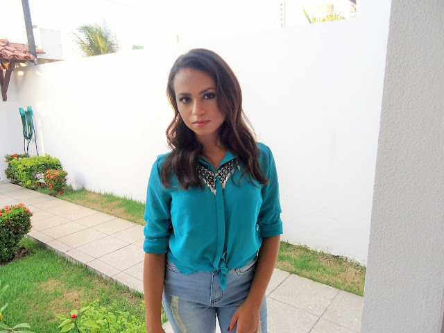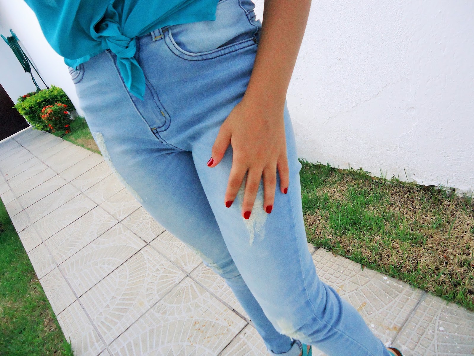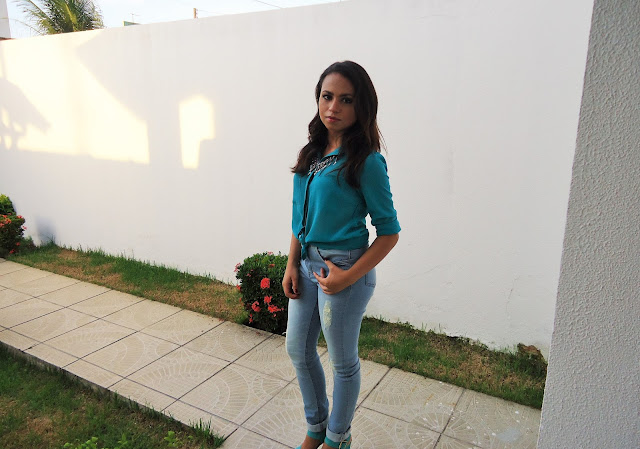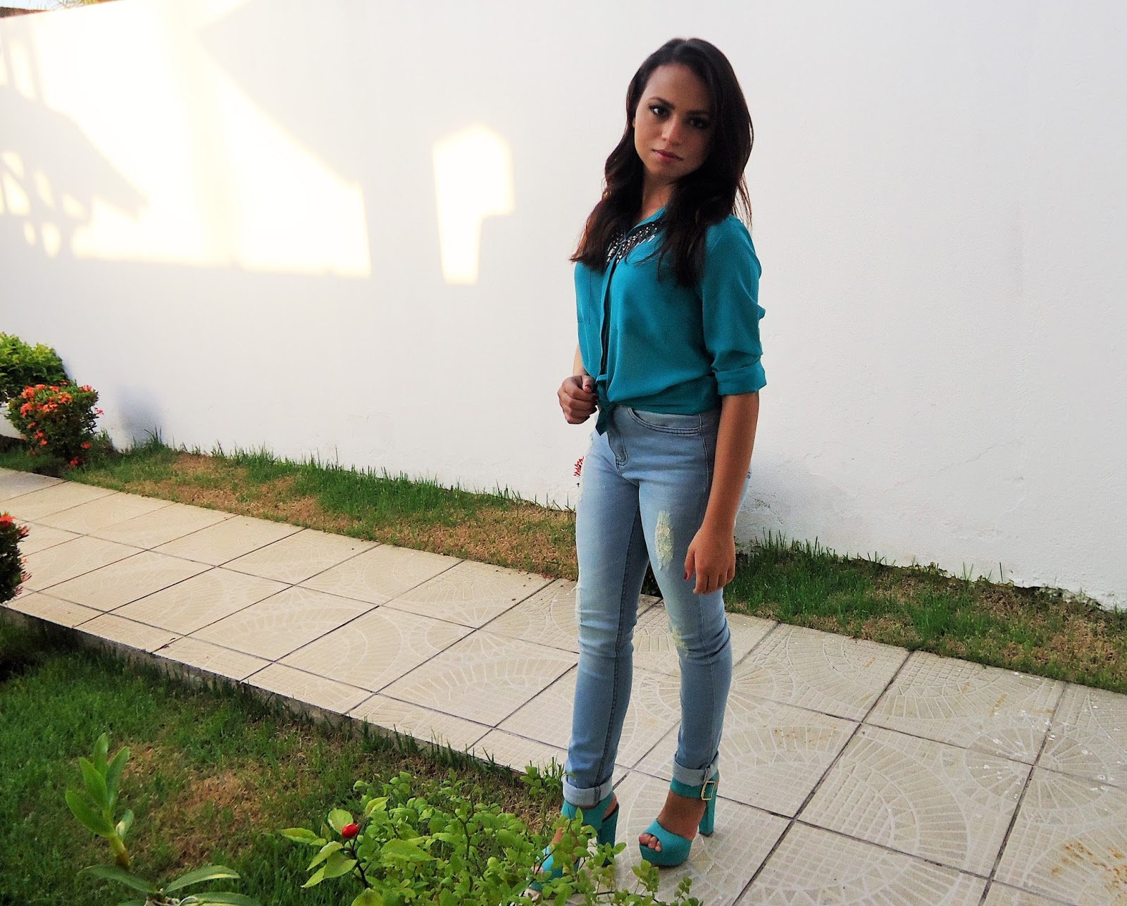 Optei por essa camisa azul turquesa amarrada com um nozinho